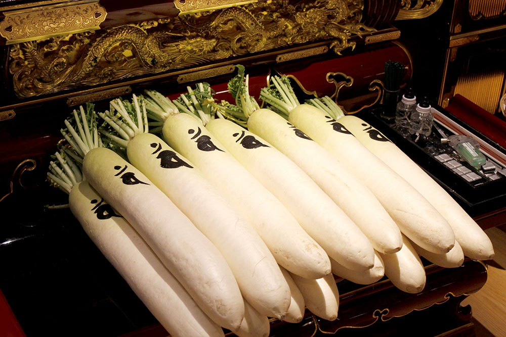 鎌倉時代にお坊様がお釈迦様にあやかり大根の切り口にお釈迦様を表す梵字を書いて悪魔除けとし供え、その後大根を炊き上げて参詣者に振る舞ったのが大根炊きのはじまりといわれています。現在は無病息災を祈願し大根を焚いてふるまいます。